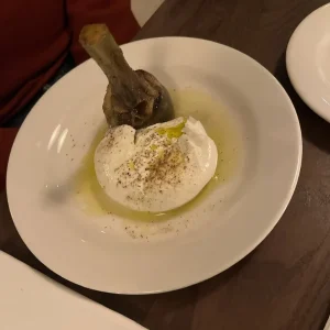 De Burrata, een zijdezachte verse kaas gemaakt van Mozarella en room. Deze kwam samen met een zachte gekonfijte artisjok. Zowel de artisjok als de Burrata waren licht gepeperd en voorzien van een scheutje extra vierge olijfolie.