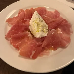 Het andere kaasgerecht was een Mozzarella die gedrapeerd was met San Daniele ham. Ook hier wat zwarte peper en een beetje olie om het gerecht net even die extra touch te geven.