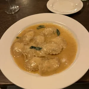 De dame aan tafel (Mireille) koos ervoor om als hoofdgerecht Ravioli te kiezen. Deze met paddenstoelen, ricotta en parmezaan gevulde pastavormpjes geserveerd in salieboter konden rekenen op haar waardering. Zeker omdat er nog een glaasje Nero d’Avola bij werd ingeschonken. Opnieuw smullen dus.