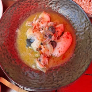 Toen kwamen de chipirones: kleine gebakken inktvisjes met knoflook en zachte uien, geserveerd in een fijne sherrysaus. Er zat zelfs een drupje inkt bovenop – geen idee of dat voor de smaak was of voor het zicht, maar het werkte.
